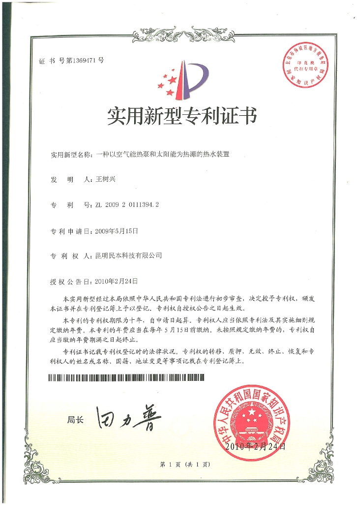 热水装置专利证书